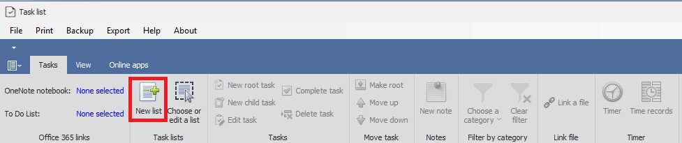 Tasklist displays a list of your tasks in a tree view. You can make as many lists as you like. When you first install the app, you won't have any lists, so you need to make one. Click on the New list button on the Tasks tab of the ribbon.