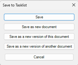 When you are ready to save a document, press the Save to Tasklist button in the ribbon bar or the backstage menu. This will bring up a menu: